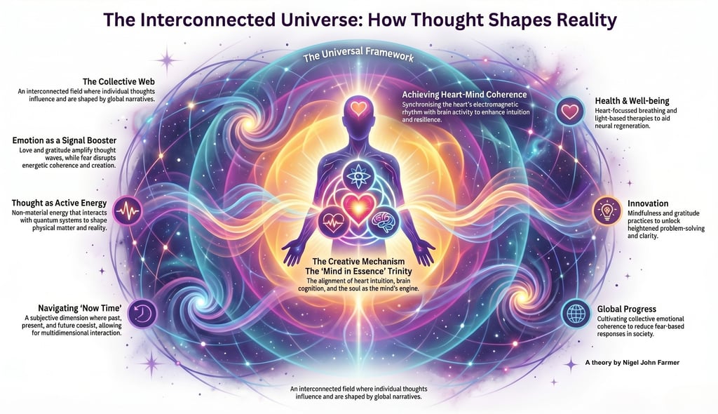 Nigel John Farmer’s Interconnected Universe Theory is a sophisticated, non-materialist framework that redefines reality as a dynamic energetic process rather than a collection of static particles. By positing that thought is a discrete energy unit and the "fundamental creative force," Farmer moves beyond traditional biocentric models to provide a specific mechanism for the construction of time and space.